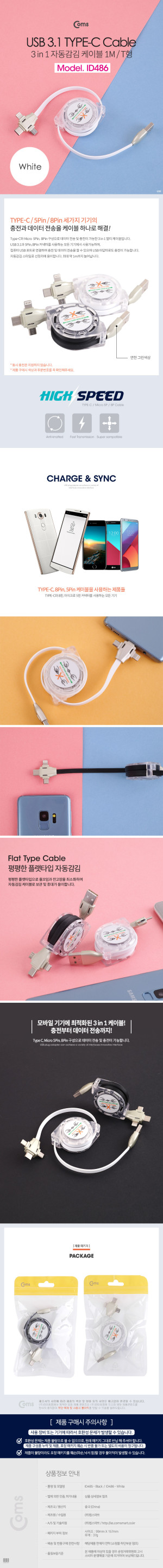 Coms 스마트폰 멀티 케이블(자동감김/3 in 1), Type C/8P/5P, 1M, 화이트-연한 그린 > usb 3.1 케이블(Type C)