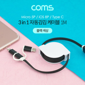 Coms 스마트폰 멀티 케이블(3 in 1/자동감김) 1M, Black / USB 3.1(Type C)&Micro 5P&iOS 8P > 자동감김/분리형