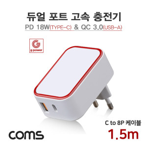 Coms G POWER 고속 충전기 2구, 가정용, USB 3.1(Type C)+USB A, 화이트, C to 8P 케이블 1.5M > 충전 제품