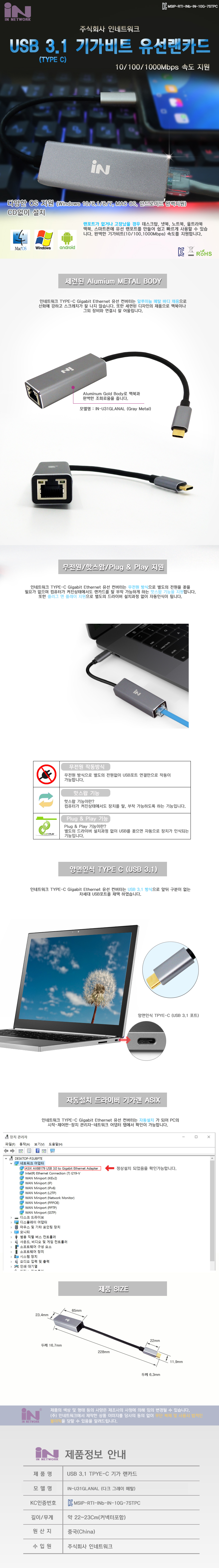 INV001 USB 3.1 C TO 기가 랜카드 골드메탈 자동인식 요약정보 및 구매